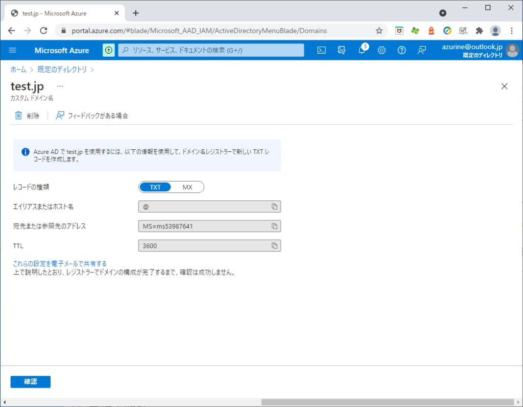 Azure AD に追加できるDNSレコードは? 2021.09.14 「TXT」と「MX」レコードのみ。 参考:https://docs.microsoft.com/ja-jp/azure/active-directory/fundamentals/add-custom-domain